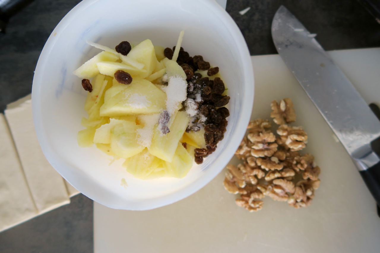Äpfel schälen vom Kerngehäuse befreien und in blättrige Scheiben schneiden. Mit Rosinen, Zucker, Vanillezucker, gehackten Walnüssen & Zimt vermischen.