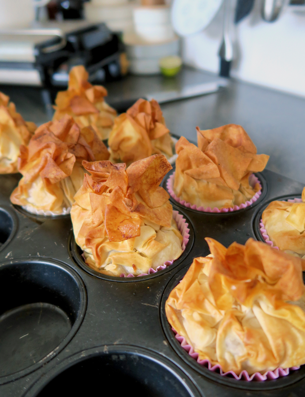 Die 4 Strudelblätter aufeinander legen vierteln. Man sollte zum Schluss 16 gleich große Studelteigblätter haben. Immer jeweils 2 mit flüssiger Butter so zusammenkleben, dass ein Stern entsteht. (Siehe Bild). Ich trage die Butter mit einem Backpinsel auf. Zuerst Brösel auf dem Strudelblatt verteilen. Etwas Apfelmasse darauf verteilen. Zu einem Säckchen zusammendrücken und die Muffinform stellen. Aussen ebenfalls mit Butter bestreichen (die man zuvor beiseite gestellt hat).