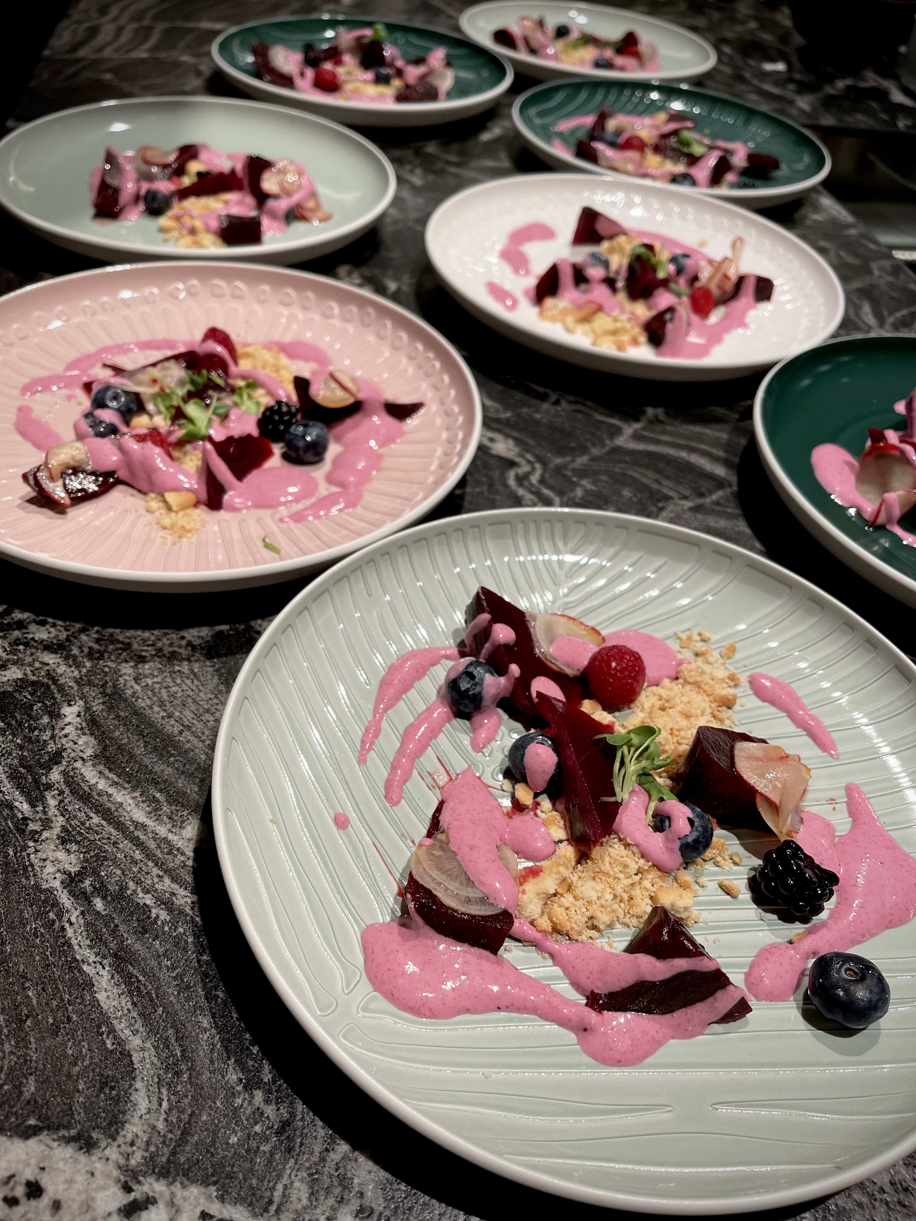 Als Vorspeise hab ich ein Gericht aus unserem Sommerurlaub nachempfunden. Vom Geschmack her war es wirklich toll, wenngleich ich noch an der Konsistenz der Roten-Rüben-Beeren Creme feilen muss. Die in Österreich erhältlichen griechischen Joghurts haben nicht den Fettgehalt und die Dichte der griechischen Joghurts, die man im Urlaub serviert bekommt. Vielleicht finde ich aber noch ein Geschäft, wo es ihn gibt. Das Gericht ist trotzdem sehr, sehr gut geworden.