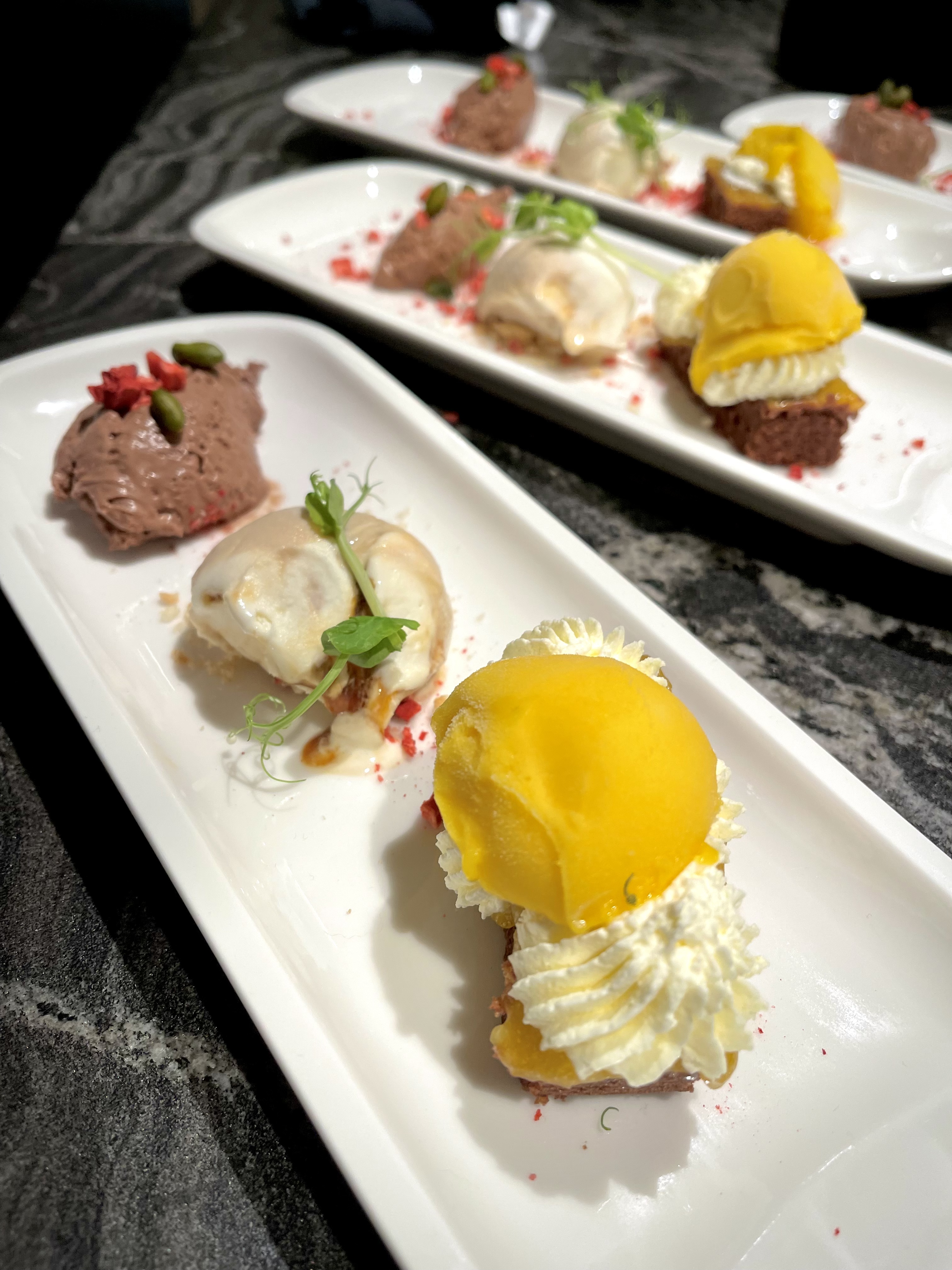 Als Nachspeise gab´s Schokokuchen mit Mangospiegel & Mangoeis, ein Valhrona Schokoladenmousse und Eis von unserem Lieblingseisgeschäft (Panna Cotta & Maroni). Das Rezept gibt´s ebenfalls in den nächsten Tagen.